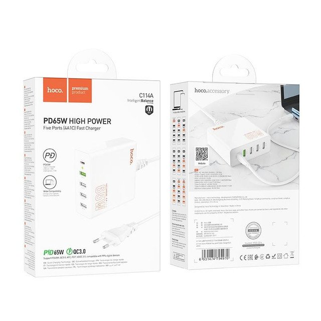 hoco C114A Vision PD 65W USB-C / Type-C + 4 USB Five Ports Fast Charger, Plug Type:EU Plug(White)