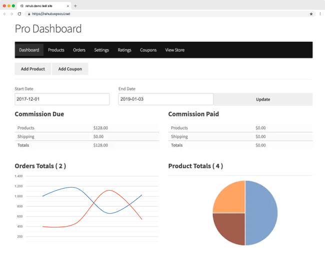 Our vendor dashboard provides vendors with an integrated frontend experience that blends seamlessly with your theme. Allow vendors to take control of their stores while you can focus on building the marketplace. Easily manage their products, orders and coupons and more.